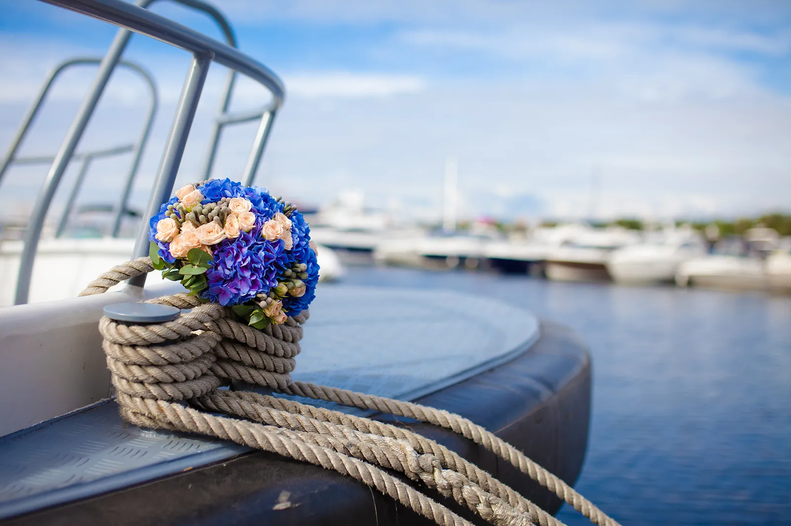 Floral Design: Beautiful bridal bouquet and buttonholes, with optional yacht decoration using flowers selected for maritime conditions and aesthetic harmony with your vessel and setting.